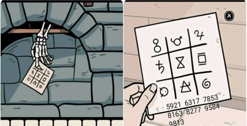 5、前往壁炉处,掀开画框上的白布以触发剧情;随后对壁炉使用对讲机,会收到一张「纸条」。仔细观察纸条上的符号,再结合收音机的频道数字,就能得到四个符号组成的密码。提示:收音机右侧墙壁上的划线对应九字键盘,可与纸条配合解读。
