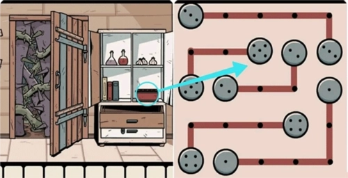 6、输入符号密码打开正大门右侧的柜子,接着点击右下方的红色盒子,完成其上的连连看机关,就能获取里面的「白色宝石」。