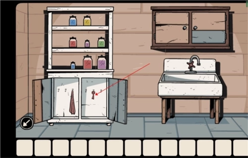 2、推开那扇蓝色的门进入盥洗室,依据照片上的提示来摆放架子上的罐子,完成这一步后取走下方的钥匙,随后打开水池上方的柜子获取对讲机,之后离开盥洗室,用拿到的钥匙去打开钟表左侧的门。
