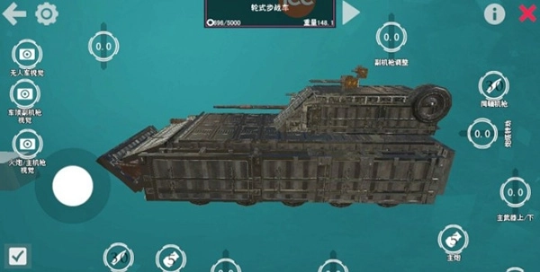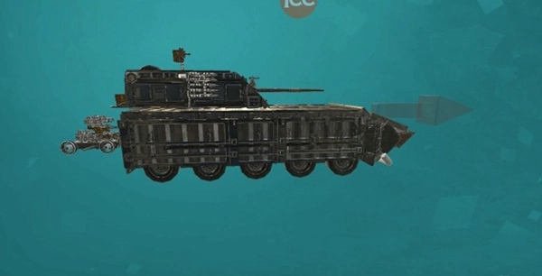 pvp专属重装版战车,附加了装甲,全方位防护,为了稳定就把两侧火箭卸了,换了三门速射炮和一挺机枪,相比之前版本火力有所下降,另外无人小车拆除了自爆,因为自动对战一开始就会自爆。战车有推进器,有坡就能上天的那种。