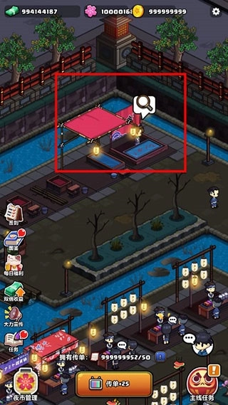 1、首先我们要在夜市里找到捞金鱼摊,接着点击捞勺(要是还没搭建捞金鱼摊的朋友,可以点击夜市管理,找到捞金鱼摊进行建造就可以了)。