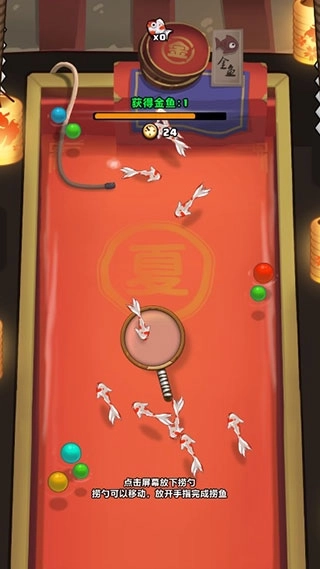 3、点击屏幕放下捞勺,捞勺支持移动操作,松开手指即可完成捞鱼动作。