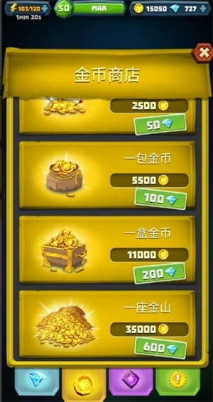 砖石用途:收集砖石至600,去商店用600砖石购买金币(一堆金山),用来升级骰子。